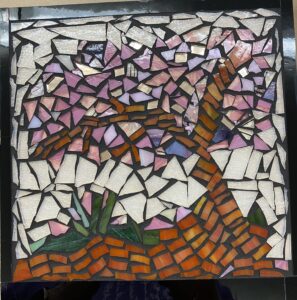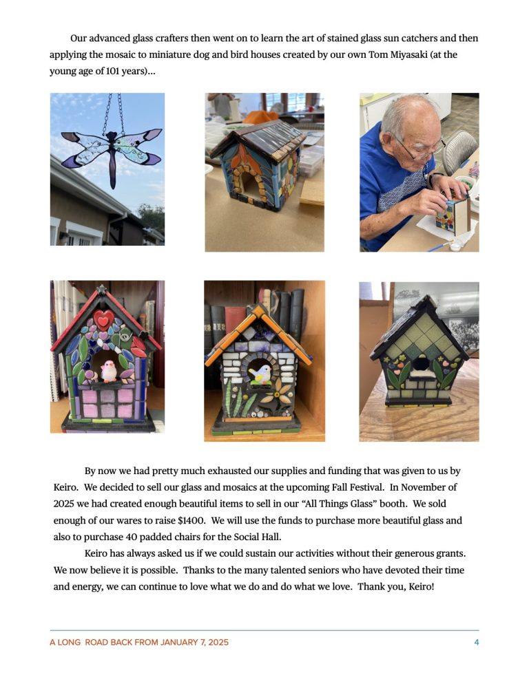 Tom Miyasaki is a 101-year-young Super Ager.  He is a talented wood craftsman and built several bird and dog houses for our class to mosaic.  These are one-of-a-kind gems that will be sold at our 2025 Fall Festival.