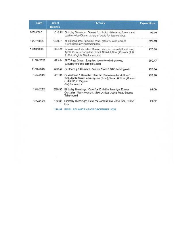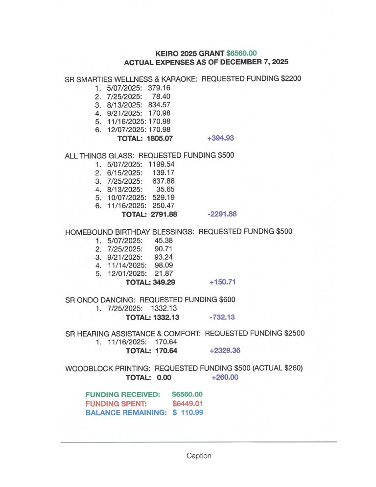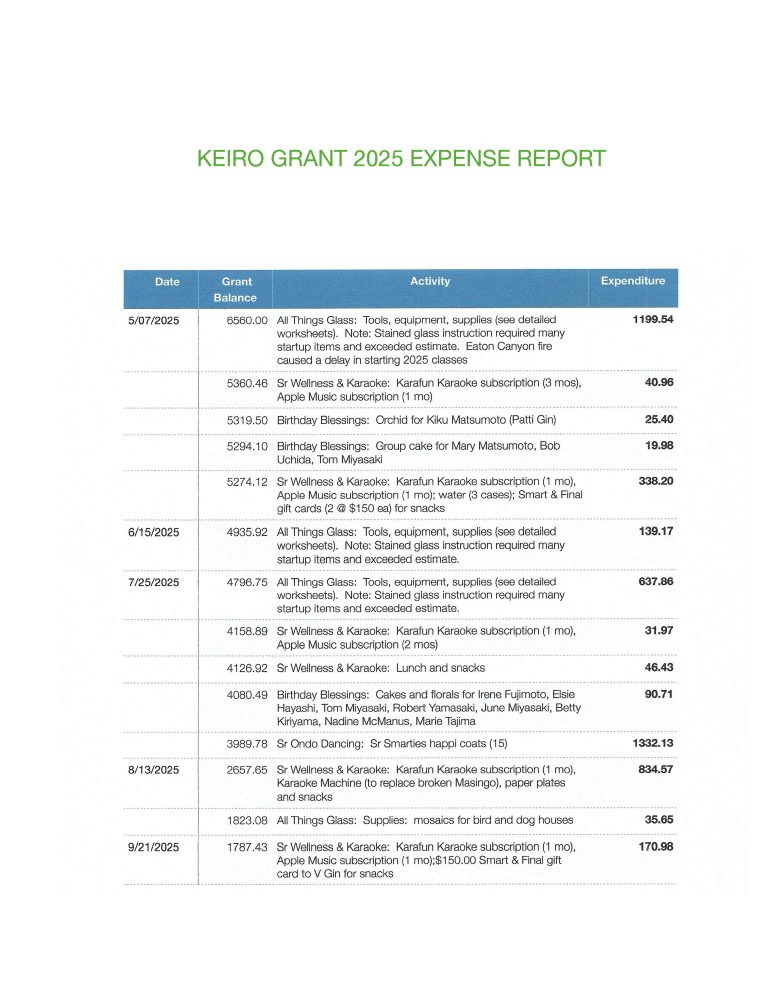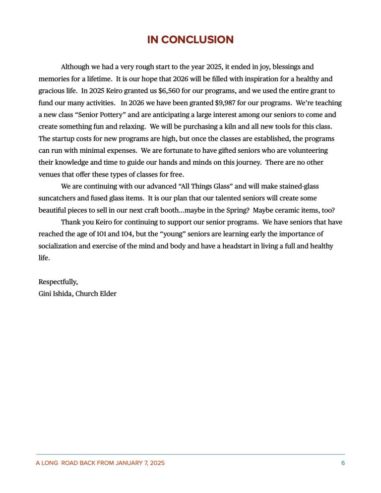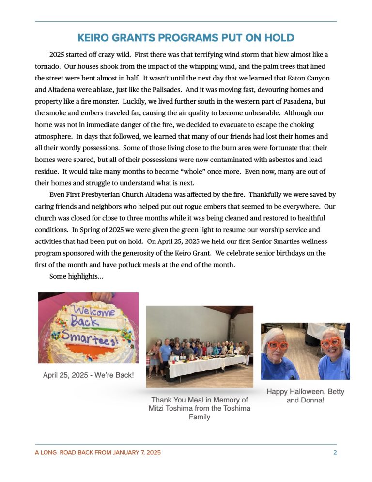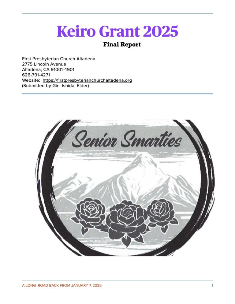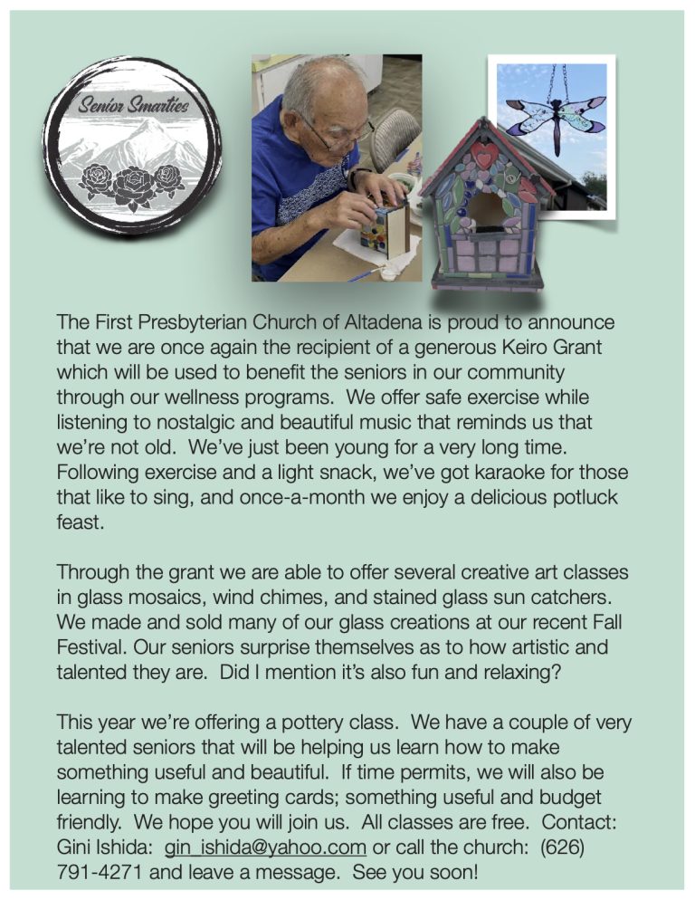Keiro has again awarded First Presbyterian Church, Altadena grant funding in 2025-2026 to support and sustain programs and services provided to older adults and caregivers in our community.  The following programs have been developed to promote healthier and more fulfilling lives of our aging seniors.  We thank Keiro for their generous grants program which continues to help our older adults and caregivers to live a long and healthy life.  Because of Keiro’s generosity, we are able to continue to offer the following programs and classes to all seniors and caregivers with the hope that the programs will provide health/wellness, purpose, connectedness, security and autonomy to all those that participate.