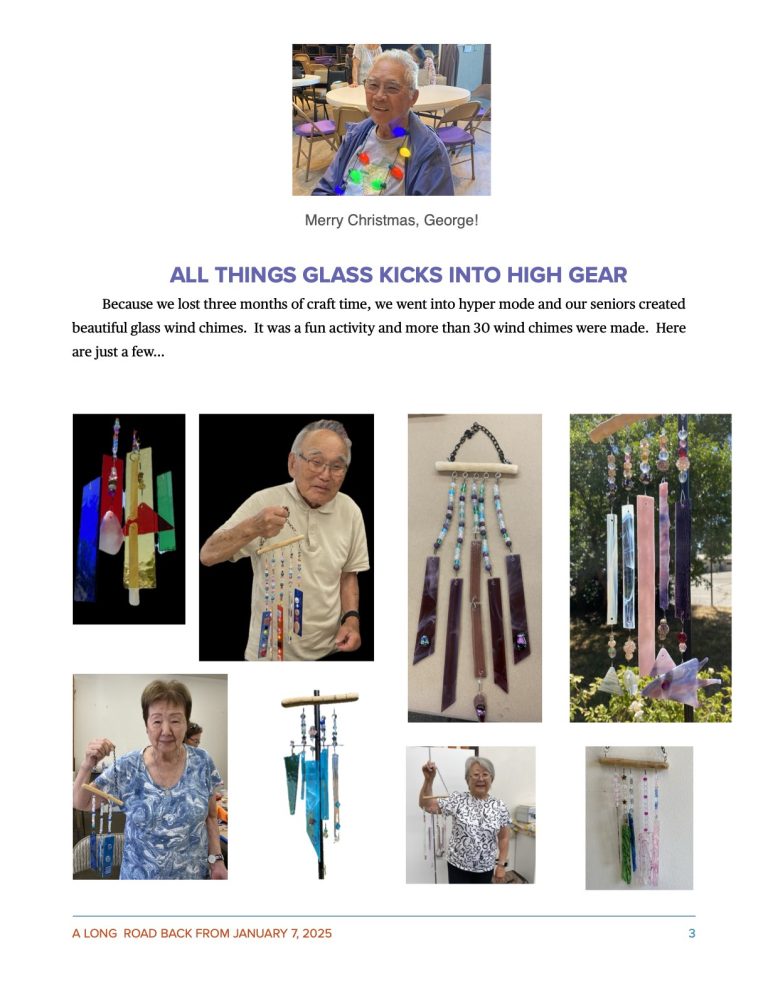 Our seniors are learning to make beautiful wind chimes out of glass.  Next they are learning the art of stained glass and designing suncatchers.  This class is challenging and rewarding and it is hoped that many of our talented seniors will join us for this creative art form.